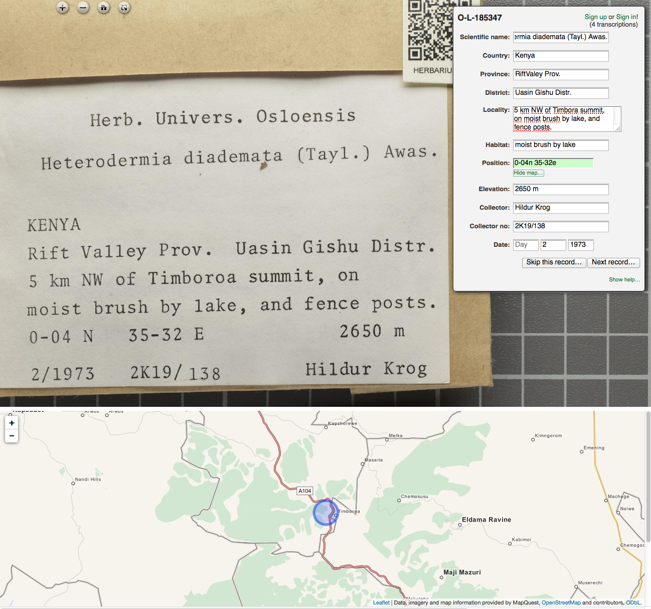 Figure 1: A new citizen science platform to capture label information from photographs of specimens in the natural history collections of Norway. Available at http://gbif.no/transcribe/