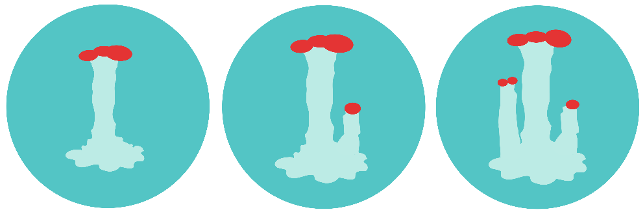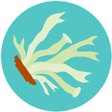 These badges, inspired by the genus Cladonia, depict fruticose type lichens which form simple stalks or bushes. The genus Cladonia includes the Pixie Cup, Peg (depicted here), and Reindeer Lichens. Peg lichens, like the one depicted here, include the species Cladonia cristatella – sometimes called “British Soldiers” for its bright red caps. Reindeer Lichens are a primary food source for Reindeer and Caribou during winter. Recently Cladonia stellaris was voted as Canada’s proposed national lichen!