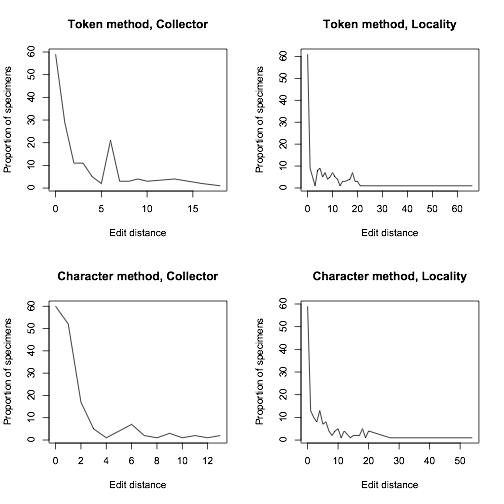 The first step in using Notes from Nature transcription data in research is checking data quality. Each specimen is transcribed independently by four different users, so mistakes in a single transcription do not impact the accuracy of our data very much. But how do we determine the right one out of the multiple transcriptions? For controlled fields such as country and state, this is simple: we perform a “vote-counting” procedure, where the value with the most “votes” is considered correct. However, this is much more difficult for open-ended fields such as locality or collector names.