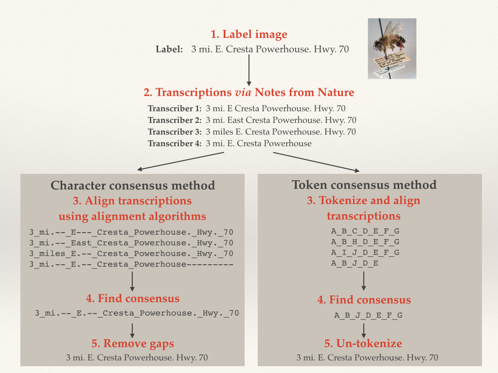 One of the early approaches was to quantify differences between transcriptions. We did this by using the Levenshtein edit distance, named for the Russian information scientist, Vladimir Levenshtein, who developed a way to quantify the minimum number of single-character edits required to change one string of text to another. For example, “12 mi W Oakland” and “12 mi. W Oakland” would have a score of 1 because of the period after “mi”. We then looked for highly similar pairs of transcriptions for each specimen (pairs that were separated by the smallest edit distance), and then chose one of the pair. Our assumption was that if two separate transcriptions are almost identical to one another then either one must be very close to being correct. However, this assumption becomes violated if users are consistently wrong (either because the label is partially obscured, or the handwriting difficult to read, etc.). Furthermore, this was not a true consensus in the sense that our algorithm only decides which transcription out of the four is the best.