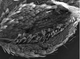Moths and butterflies comprise the order Lepidoptera. The name comes from Latin meaning “scale-wings,” referring to the layers of microscopic scales that make up the color patterns on the wings and body (that powder you got on your fingers if you ever touched a butterfly’s wings). These scales can take on many shapes, sizes, and colors depending on their role in camouflage, mating, or protecting eggs. Scale color patterns are very useful in identifying different species of Lepidoptera – most Americans can recognize a monarch butterfly by its black and red pattern. But they are also the focus of very intense research in evolutionary development, biomechanics, biochemistry, and other areas of ecology and evolution. In one of the Hawaiian moths that I study (Cydia) there are special pouches on the male wings that contain pheromone-producing glands and special “sex” scales that help disperse the mate-attracting odors.