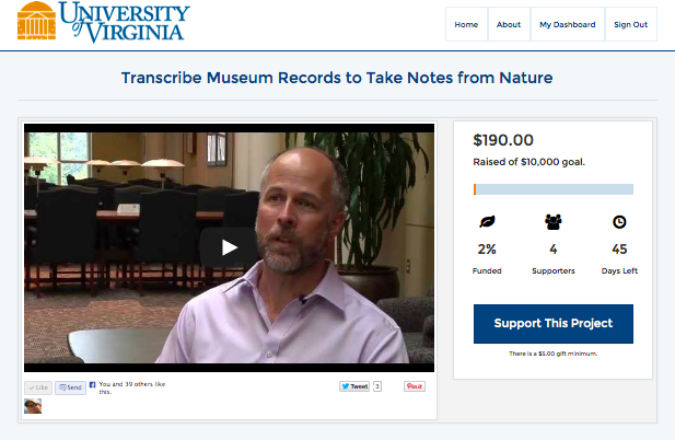 We believe that citizen scientists can play a significant role in helping researchers gain access to the wealth of information held within the more than 2 billion biological specimens around the world. Access to this information is critical for answering all sorts of questions ranging from how species change to the effects of public policies. In this campaign, we will be raising money to support the Notes from Nature citizen science crowd sourcing project through the hiring of student interns who will strengthen our engagement between the science teams and the vital citizen scientists. The crowd funding campaign and this specific internship work is being managed through our partners at the University of Virginia, but will support outreach activities across the entire Notes from Nature community.
